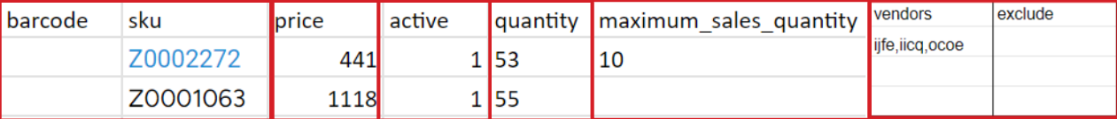 3. **Vendors**: If you want to create an update for two or more vendors in the same file, you can use the Multivendor option. For that you can add 2 more columns to the existing file:* `vendors` \- in this column you can add all vendors (stores in the chain) you want to run this update for separating with comma. If you want to run the update for all vendors, you can simply put ‘all’ in that column* `exclude` \- in order to use this column, you have to put ‘all’ in the column ‘vendors’ and use the column ‘exclude’ for the vendors you want to exclude from the update. Separate the vendors by using commas.
