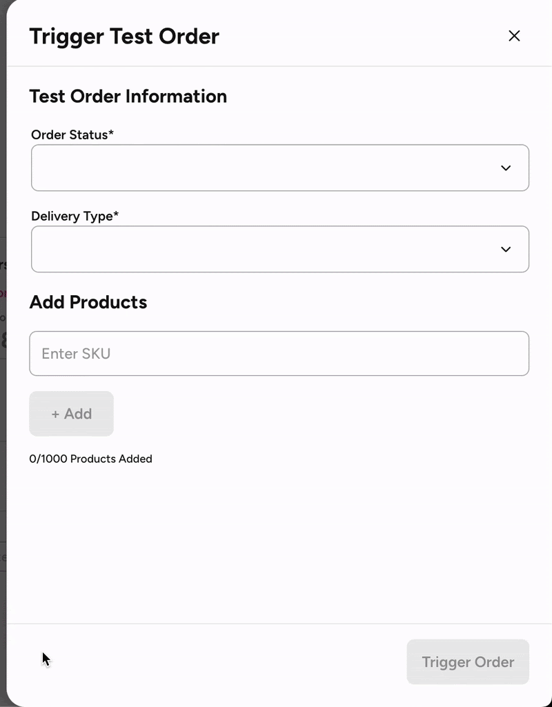 Once the integration type is configured on the store and webhook is configured. Partner Portal will show a test order button to trigger a test order.